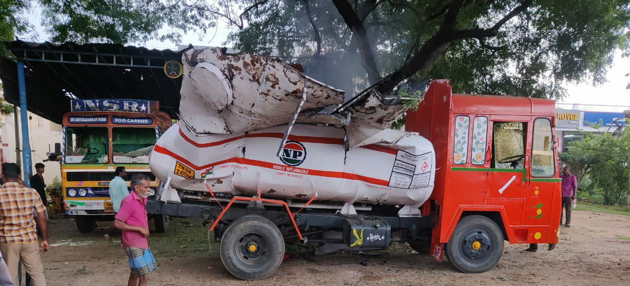 நாமக்கல்லில், வெல்டிங் வைக்கும்போது, லாரி டேங்கர் வெடித்ததில், பட்டறை உரிமையாளர் பரிதாபமாக உயிரிழந்தார். பண்ருட்டியை சேர்ந்தவர் பெரியசாமி முதலைப்பட்டியில் வசித்து வரும் அவர், 15 ஆண்டுகளாக, நாமக்கல்-சேலம் சாலை, பொன்நகரில், ‘மாருதி டேங்கர் லேபர் ஒர்க்ஸ்’ என்ற பெயரில், பட்டறை நடத்தி வந்தார்.இந்நிலையில், இன்று மாலை, 5:30 மணிக்கு, பெட்ரோல் நிரப்பி செல்லும் டேங்கர் லாரி ஒன்று, பழுதை சரி செய்வதற்காக, பெரியசாமி பட்டறைக்கு வந்தது. காலியாக இருந்த டேங்கரில், கசிவு ஓட்டையை அடைப்பதற்காக வெல்டிங் வைக்க முயற்சித்துள்ளார். அப்போது, டேங்கரில் ஏற்கெனவே சிறிய அளவில் இருந்த பெட்ரோல் தீப்பிழம்பாகி வெடித்து சிதறியது. இந்த விபத்தில், துாக்கிவீசப்பட்ட பெரியசாமி, படுகாயம் அடைந்து, சம்பவ இடத்திலேயே பரிதாபமாக உயிரிழந்தார்.தகவல் அறிந்த, நாமக்கல் தீயணைப்பு படையினர், டேங்கர் லாரியில் ஏற்பட்ட தீயை அணைத்து, தீ மேலும் பரவாமல் தடுத்தனர். இச்சம்பவம் தொடர்பாக, நாமக்கல் போலீசார் வழக்கு பதிந்து விசாரிக்கின்றனர். இச்சம்பவம் பொன்நகர் பகுதியில் பெரும் பரபரப்பை ஏற்படுத்தி உள்ளது.