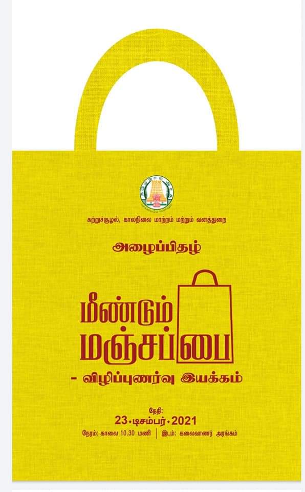 சென்னையில் கலைவாணர் அரங்கில் மஞ்சள் பை இயக்கத்தை முதலமைச்சர் மு.க.ஸ்டாலின் தொடங்கி வைத்தார். துணிப்பை புழக்கத்தை ஏற்படுத்த மீண்டும் மஞ்சப்பை பரப்புரை தொடங்கப்பட்டுள்ளது. மேலும், மாற்றுப் பொருள் தயாரிப்பு குறித்து விளக்க கண்காட்சிக்கும் ஏற்பாடு செய்யப்பட்டுள்ளது.