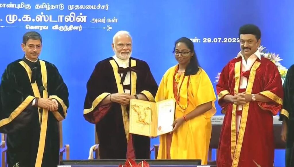அண்ணா பல்கலை. பட்டமளிப்பு விழாவில் பிரதமர் மோடி பங்கேற்று உள்ளார். விழாவில் தலைமை உரையாற்றி 69 மாணவர்களுக்கு தங்கப்பதக்கம், சான்றிதழ்களை பிரதமர் மோடி வழங்குகிறார். எஞ்சியோருக்கு ஆளுநர் ரவி பட்டங்களை வழங்குகிறார்; முதலமைச்சர் மு.க.ஸ்டாலின் விழாவில் சிறப்புரையாற்றுகிறார்.