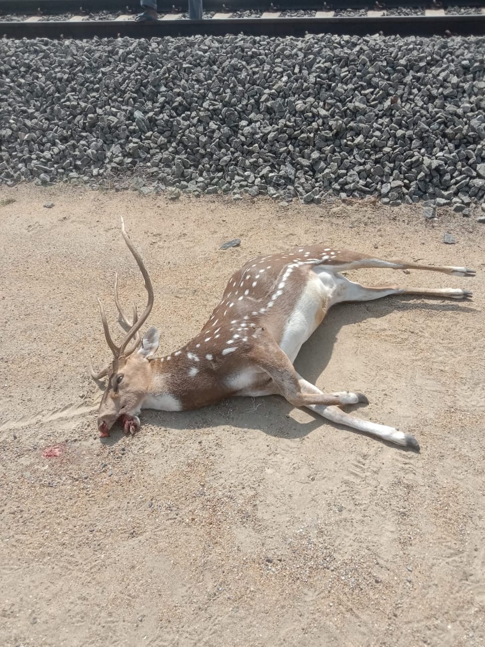 தமதுரை மாவட்டம் கள்ளிக்குடி தாலுகா சிவரக்கோட்டை பகுதியில் தண்டவாளத்தை கடக்க முயன்ற 5 வயது ஆண் புள்ளிமான் எக்ஸ்பிரஸ் ரயில் மோதி விபத்துக்குள்ளானதில் சம்பவ இடத்திலேயே பலியானது