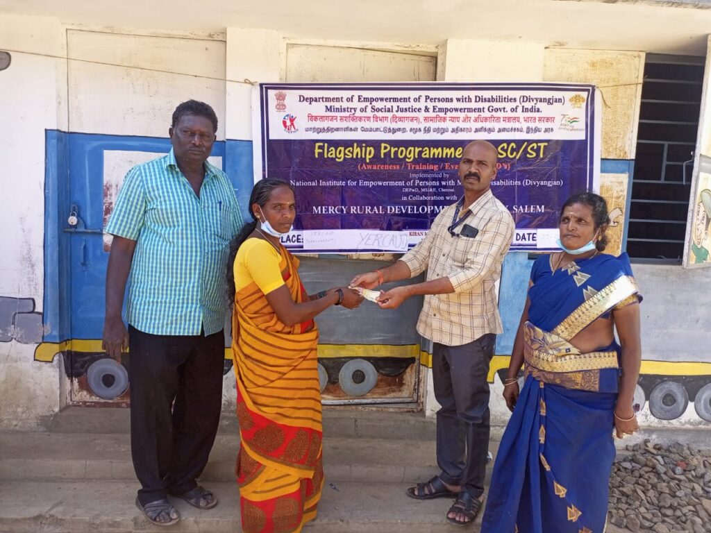 மெர்சி கிராம் முன்னேற்ற சங்கம் மத்திய அமைச்சகத்தின் சமூக நீதி மற்றும் அதிகாரம் துறையின் கீழ் இயங்கும் மாற்று திறனாளிகளின் மேம்பாட்டிற்கான தேசிய நிறுவனம் NIEPWD இணைந்து மாற்று திறனாளிகள் குறித்து பழங்குடி மக்களுக்கான விழிப்புணர்வு நிகழ்ச்சி சேலம் மாவட்டம் ஏற்காடு வட்டம் நாகலூர் பஞ்சாயத்து சொரக்காபட்டி கிராமத்தில் பழங்குடி மக்கள் சுய உதவி குழு பொறுப்பாளர்களுக்காக 27.02.2022 அன்று நடைபெற்றது.இதில் பழங்குடி மக்களுக்கான வாழ்வாதார கூட்டமைப்பின் ஏற்காடு பகுதி பொறுப்பாளர் திருமதி சுந்தரி, தி.சக்திவேல்