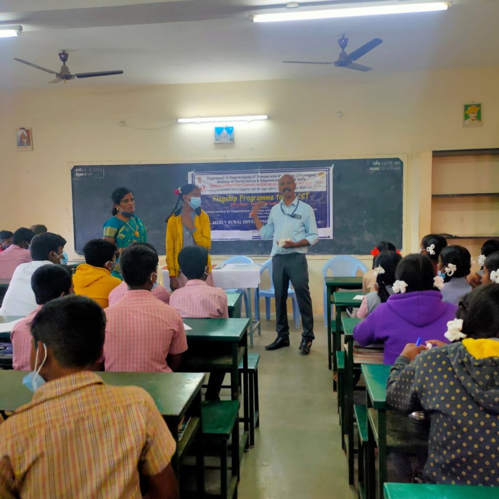 மெர்சி கிராம் முன்னேற்ற சங்கம் மத்திய அமைச்சகத்தின் சமூக நீதி மற்றும் அதிகாரம் துறையின் கீழான இயங்கும் மாற்று திறனாளிகளின் மேம்பாட்டிற்கான தேசிய நிறுவனம் NIEPWD இணைந்து மாற்று திறனாளிகள் குறித்து பழங்குடி மக்களுக்கான விழிப்புணர்வு நிகழ்ச்சி சேலம் மாவட்டம் ஏற்காடு வட்டம் நாகலூர் பஞ்சாயத்து அரசு மாதிரி உயர்நிலை பள்ளியில் பள்ளி மாணவர்களுக்கு 26.02.2022 அன்று நடைபெற்றது.இதில் நாகலூர் பள்ளி பொறுப்பு தலைமையாசிரியர் தலைமை தாங்கினார். மெர்சி கிராம முன்னேற்ற சங்க செயலாளர் திருமதி சியாமளா ,