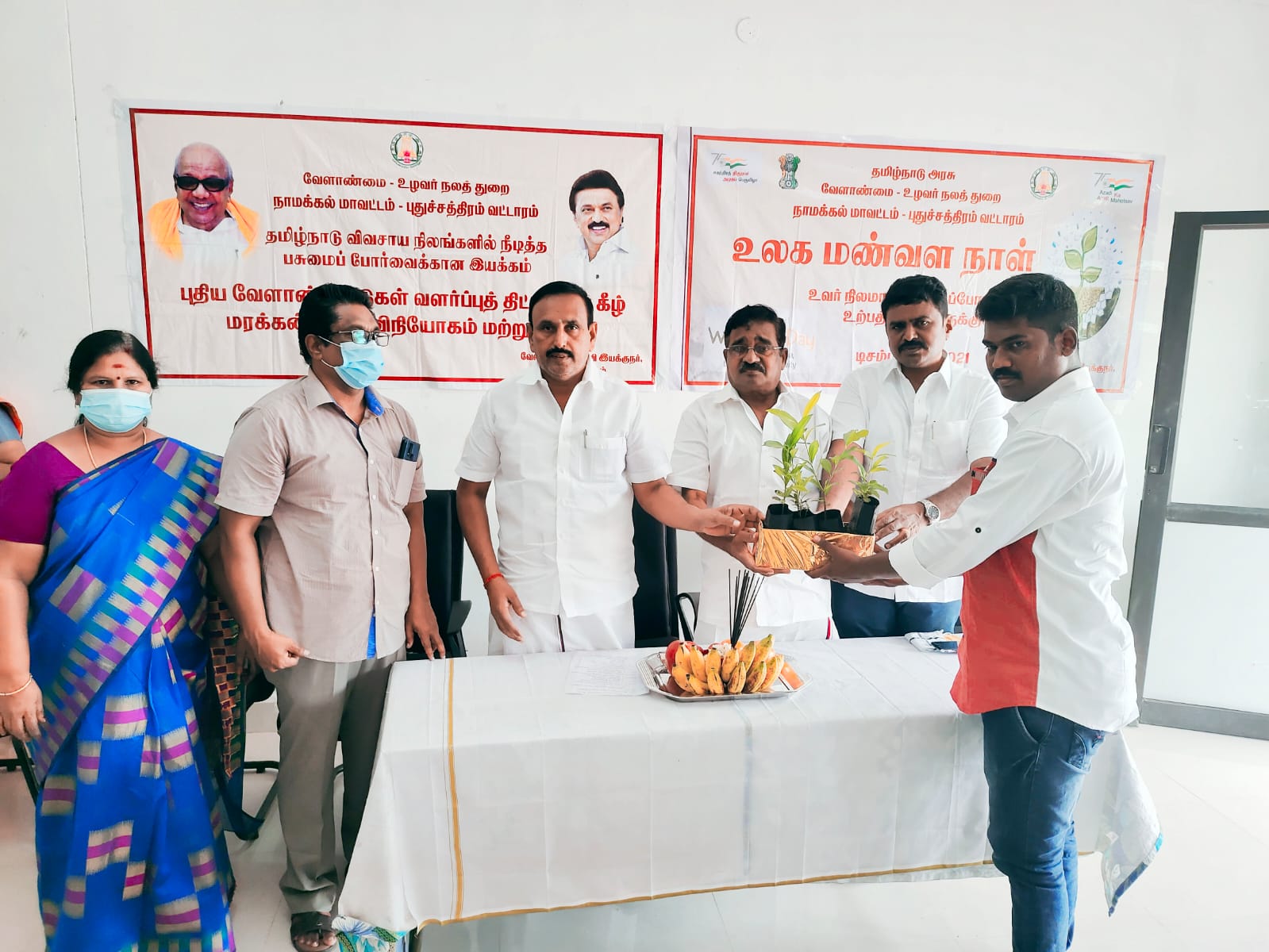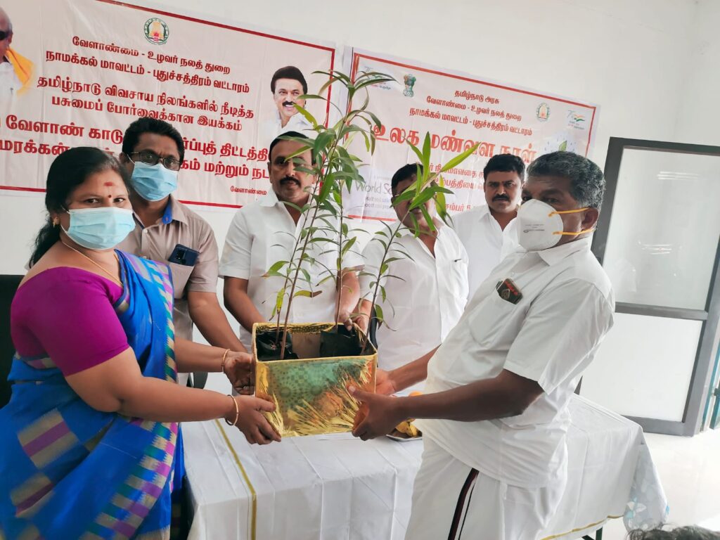 ஒருங்கிணைந்த வேளாண்மை விரிவாக்க மையம், புதுச்சத்திரம் வட்டார அலுவலகத்தில் நடைபெற்ற “உலக மண்வள நாள்” நிகழ்ச்சியில் நாமக்கல் சட்டமன்ற உறுப்பினர் பெ.ராமலிங்கம் அவர்கள் கலந்துகொண்டு புதிய வேளாண் காடுகள் வளர்ப்புத் திட்டத்தின் மூலம் விவசாயிகளுக்கு தேக்கு, நாவல்,வேம்பு,நெல்லி,பெருநெல்லி, ஆகிய மரக்கன்றுகள், மானியத்துடன் தார்ப்பாய் உள்ளிட்ட விவசாய உபகரணங்கள் மற்றும் மண்பரிசோதனை சான்றிதழ், உள்ளிட்டவற்றை வழங்கி சிறப்புரையாற்றினார்.
