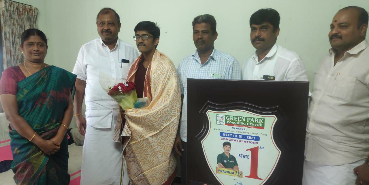 நீட் தேர்வில் 710 மதிப்பெண் பெற்று தமிழக அளவில் முதலிடம் பிடித்த நாமக்கல் கிரீன் பார்க் பள்ளி மாணவர் பிரவினுக்கு நேரில் சென்று பொன்னாடை அணிவித்து வாழ்த்து தெரிவித்தார். நாமக்கல் பாராளுமன்ற உறுப்பினர் AKP.சின்ராஜ் MP இந்த நிகழ்வின் போது கொங்குநாடு மக்கள் தேசியக் கட்சியின் நாமக்கல் தெற்கு மாவட்ட செயலாளர் VS.மாதேஸ்வரன், வர்த்தக அணி செயலாளர் குரு இளங்கோ மற்றும் மாணவனின் பெற்றோர் உடன் இருந்தனர்.