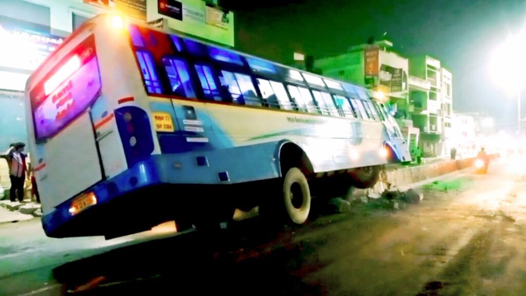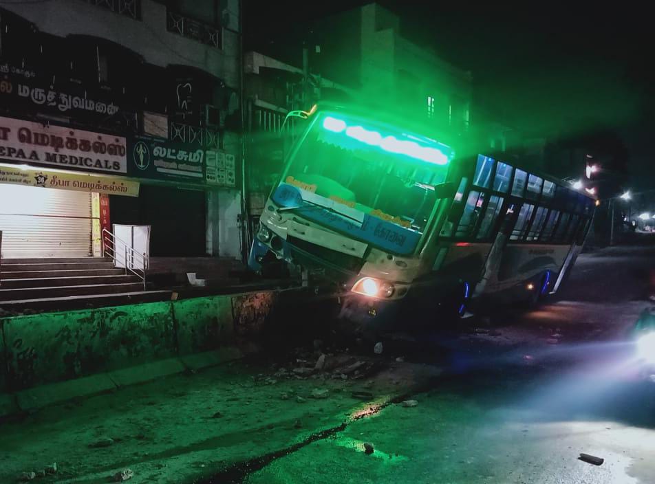 ஓட்டுநரின் கட்டுப்பாட்டை இழந்து,தடுப்புகள் மீது மோதி விபத்துக்குள்ளான பேருந்து.