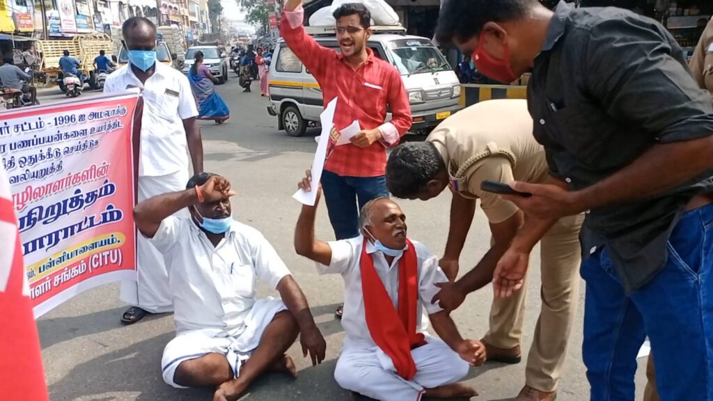 வீடு இல்லாத கட்டுமான தொழிலாளிக்கு இலவச வீடு அடுக்குமாடி குடியிருப்பு வீடு கட்ட வழங்க வேண்டும் உள்ளிட்ட பல்வேறு கோரிக்கைகளை வலியுறுத்தி நடைபெற்ற இந்த சாலை மறியல் போராட்டத்தில் சரபோஜன் மாவட்ட துணைத்தலைவர், கண்ணன் மாவட்ட பொருளாளர், மாவட்டக்குழு உறுப்பினர்கள் துரைசாமி ,