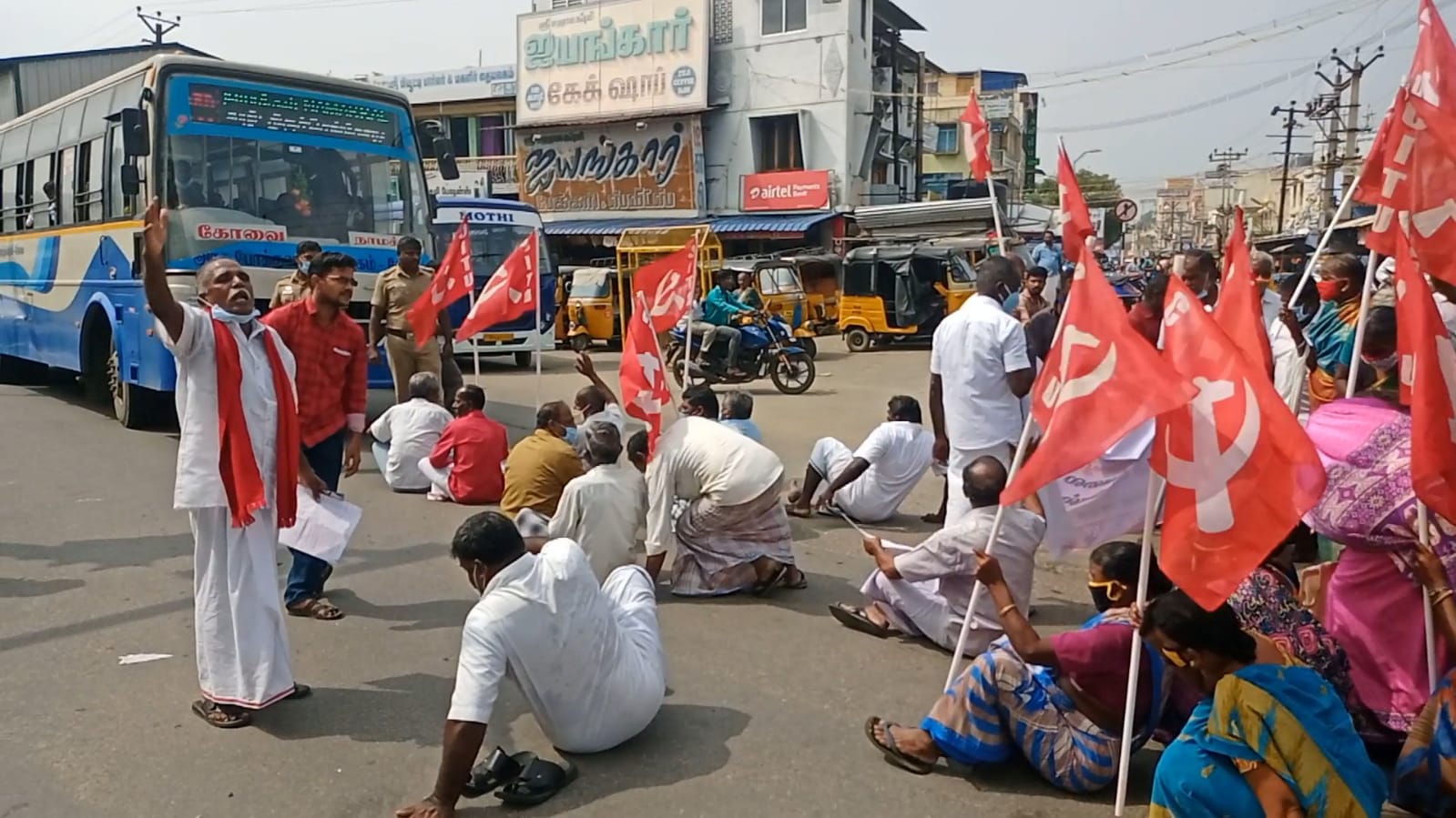 வீடு இல்லாத கட்டுமான தொழிலாளிக்கு இலவச வீடு அடுக்குமாடி குடியிருப்பு வீடு கட்ட வழங்க வேண்டும் உள்ளிட்ட பல்வேறு கோரிக்கைகளை வலியுறுத்தி நடைபெற்ற இந்த சாலை மறியல் போராட்டத்தில் சரபோஜன் மாவட்ட துணைத்தலைவர், கண்ணன் மாவட்ட பொருளாளர், மாவட்டக்குழு உறுப்பினர்கள் துரைசாமி ,