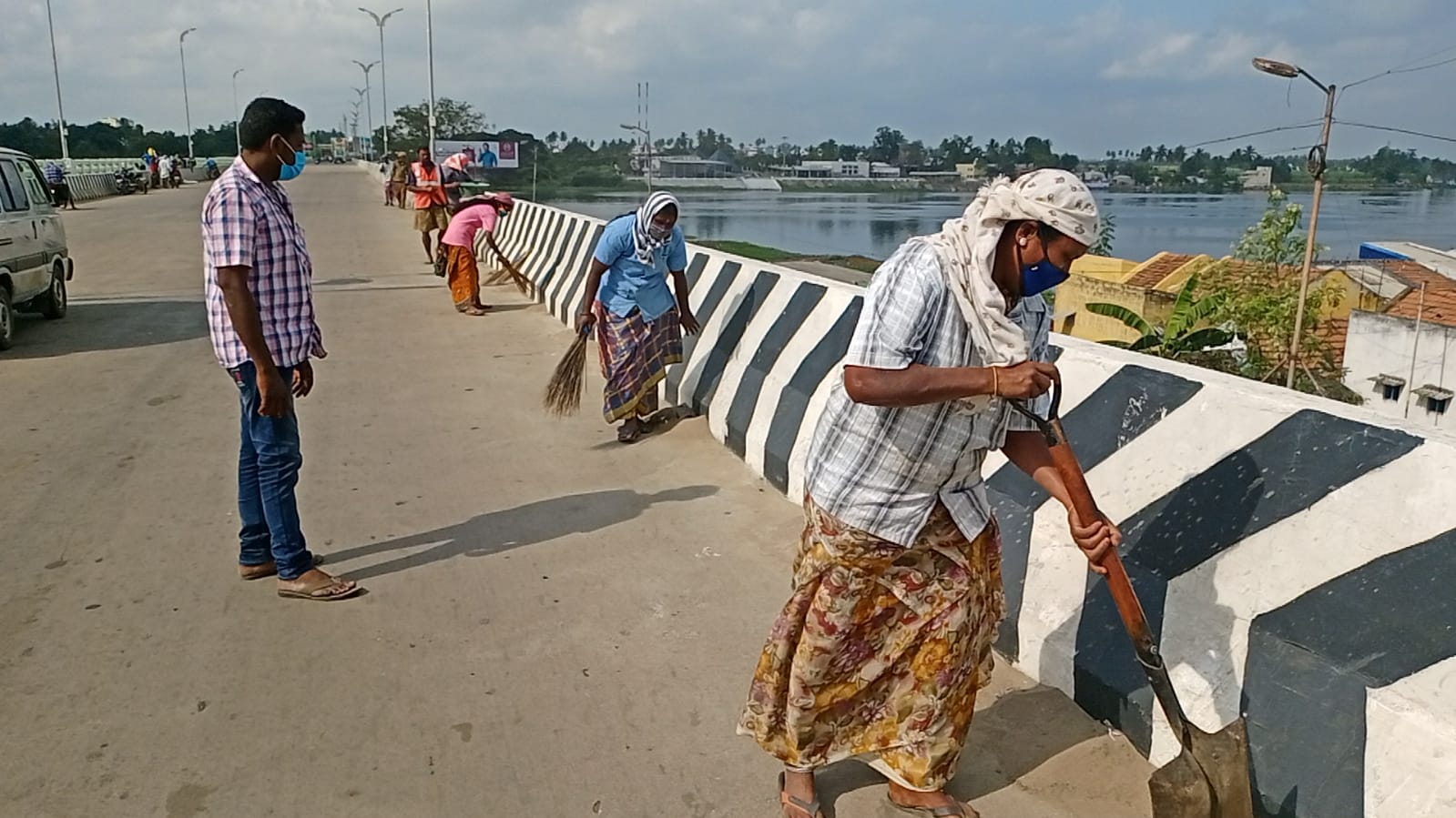 பள்ளிபாளையம் காவிரி பாலத்தில் தூய்மை பணியில் ஈடுபட்ட நகராட்சி ஊழியர்கள்