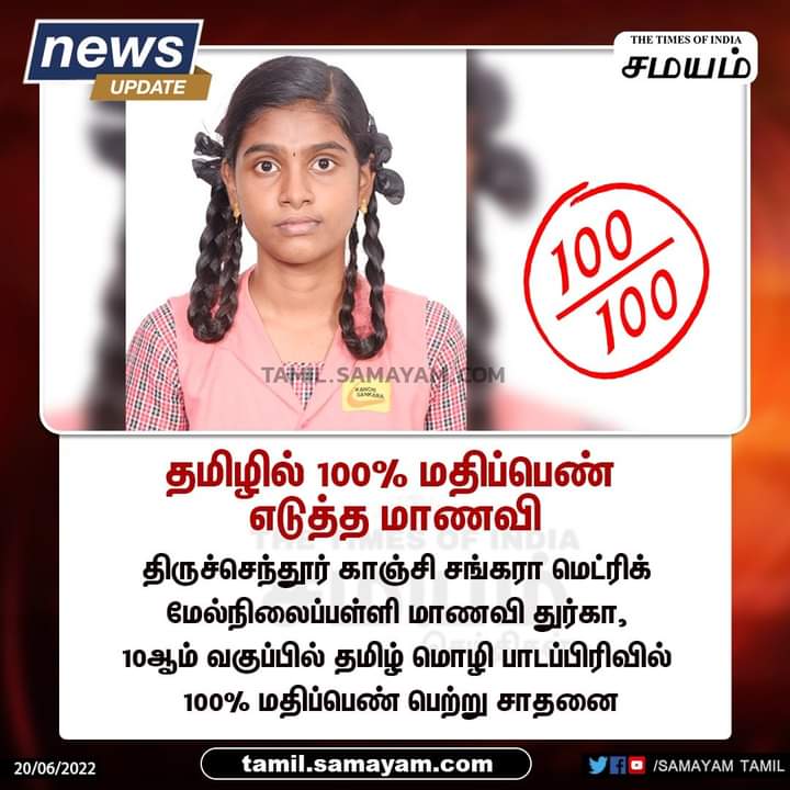 பத்தாம் வகுப்பு பொது தேர்வு த முடிவுகள் இன்று காலை அறிவிக்கப்பட்டது இந்நிலையில் தமிழகத்தில் தமிழ் மொழி பாடத்தில் 100 மதிப்பெண்கள் பெற்ற ஒரே மாணவியாக திருச்செந்தூர் காஞ்சி சங்கர மெட்ரிக் மேல்நிலைப் பள்ளியில் பயிலும் துர்கா என்னும் மாணவி பெற்றுள்ளார்.